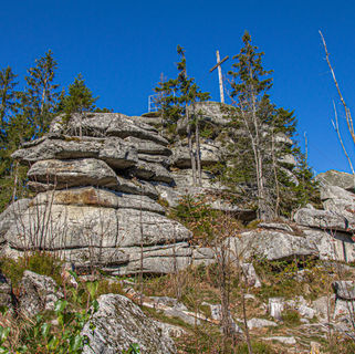 Mitten im Wald erhebt sich diese Steinwand. Vom Gipfel aus schweift der Blick über das gesamte Steinerne Meer vom Dreisessel bis zum Plöckestein.