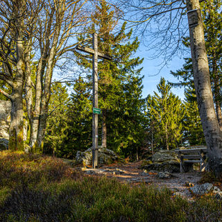 Vom Gipfelkreuz geht es weiter Richtung Hirschenstein bis nach wenigen Metern links der Pfad zum Hochberg angeschrieben ist.